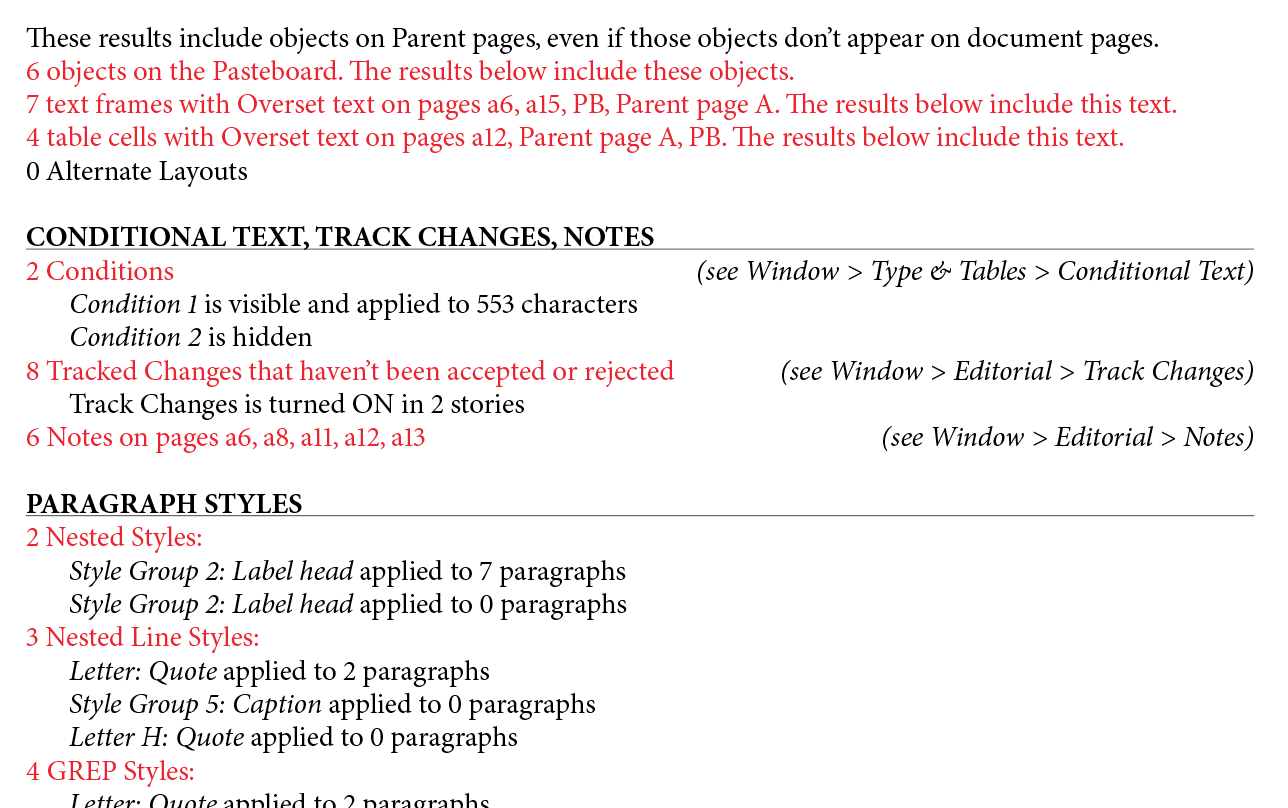 I just posted a new free InDesign script that I'm excited about. "Analyze document" is a script that, once installed, adds an "Analyze Document" command to the File menu. When you run this command on an open document, the script reports on all kinds of aspects of the file, like how many overset text frames there are, and on which pages. Whether or not the document contains conditional text, variables, tracked changes, hidden spreads, non-printing layers, and much, much, much more. I find this really useful to run anytime I inherit a document from someone else that needs further editing. Thank you to CreativePro for underwriting much of the development cost of this script! Get the script here.