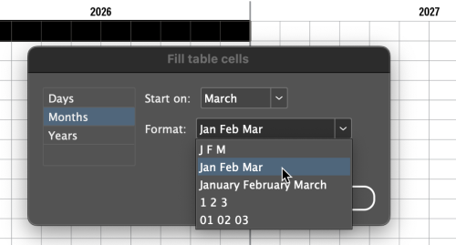 While preparing for an upcoming SMPS seminar, I've been working on ways to streamline the production of gantt charts in InDesign. One of the pain points of this process is populating table headers with "January, February, March…" and "2025, 2026, 2027…" So I whipped up a little script to make this painless.