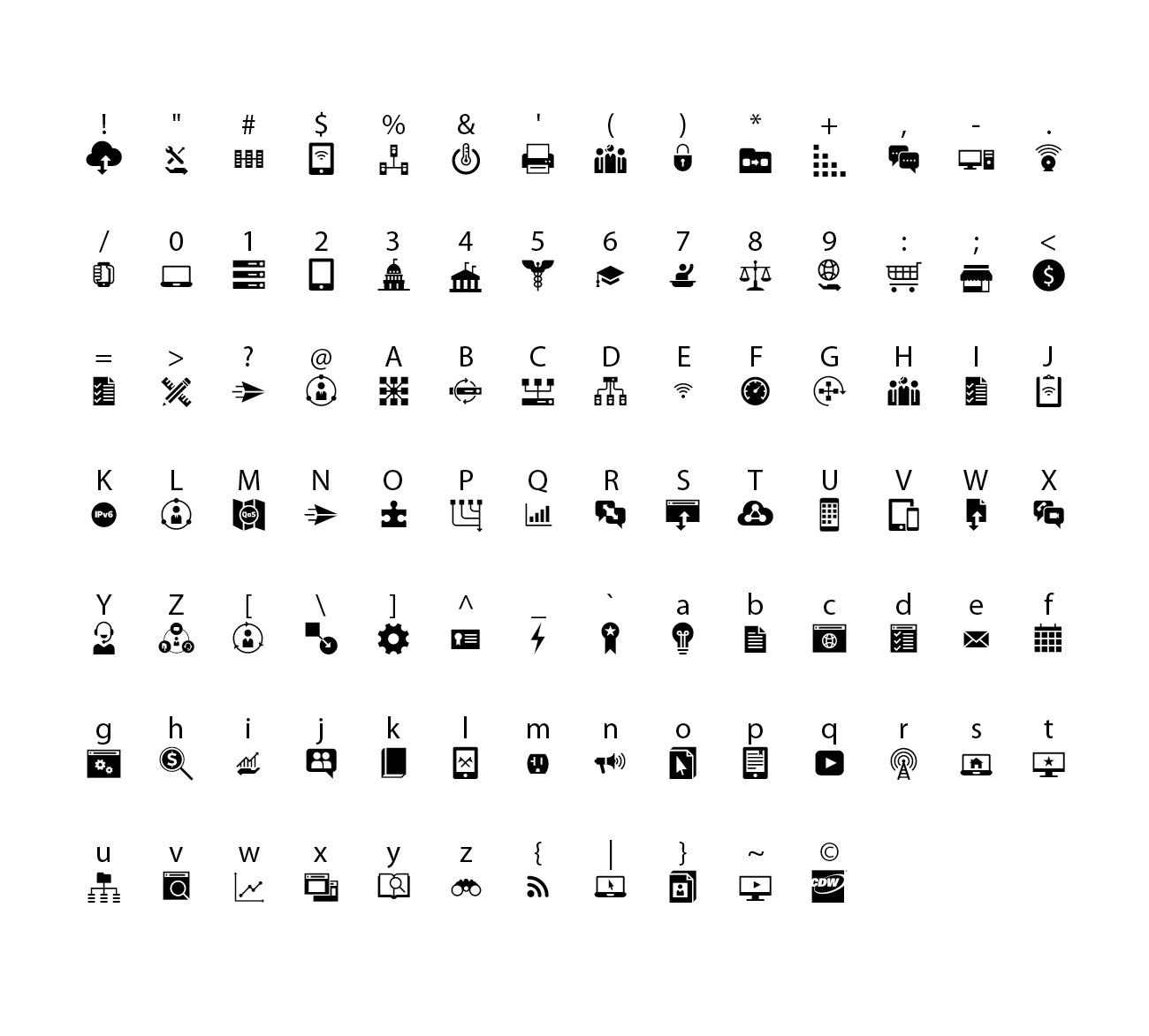 CDW needed a font consisting of dozens of custom icons for use in their mobile app as well as print marketing materials. Their designers had already created each icon in Illustrator, but they wanted the icons incorporated into a font. I created a custom “CDWMarketingIcons” font for them and delivered it in OpenType, eot, svg, ttf, and woff formats.