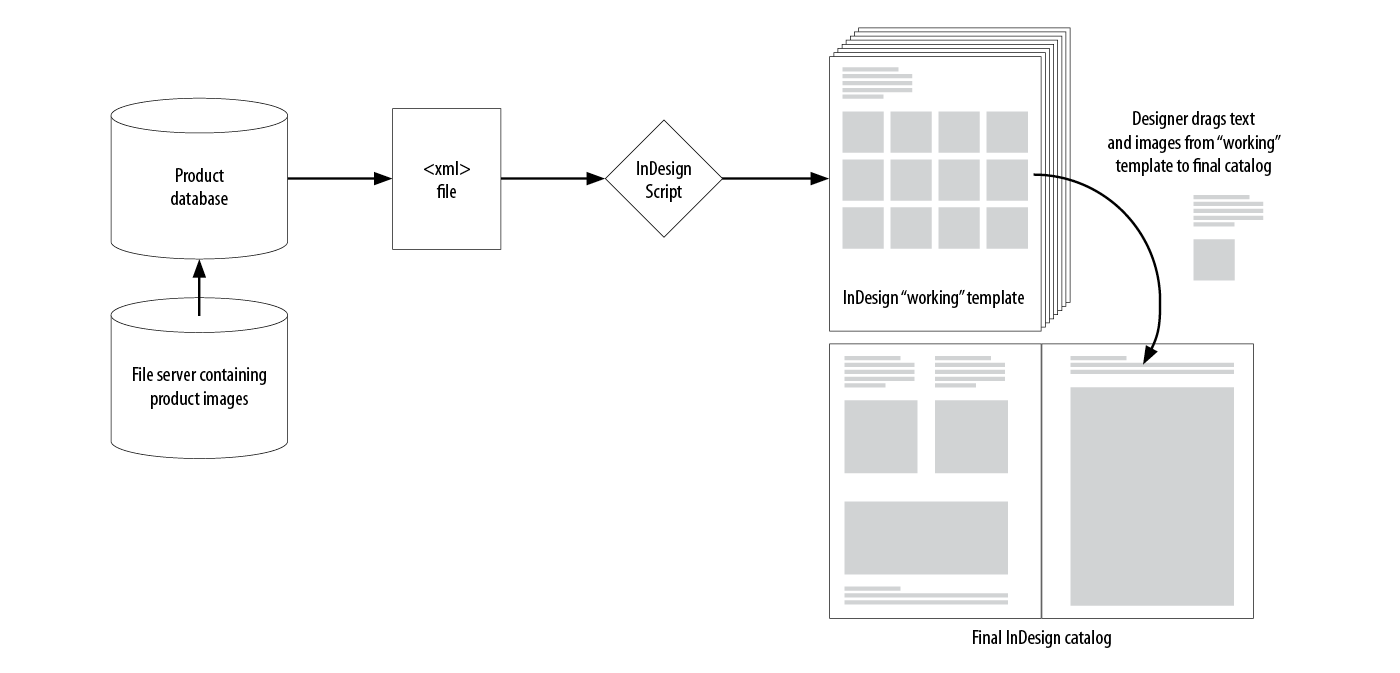 To create a catalog, the IT department creates an XML file of all the products to be included in that catalog. The designer imports this XML file into an InDesign “working template” and runs the script. The script places one product name, description and price per page, formatted with the same paragraph and character styles as the master template. The script then places all the product images associated with each product, all sized equally into manageable sizes.