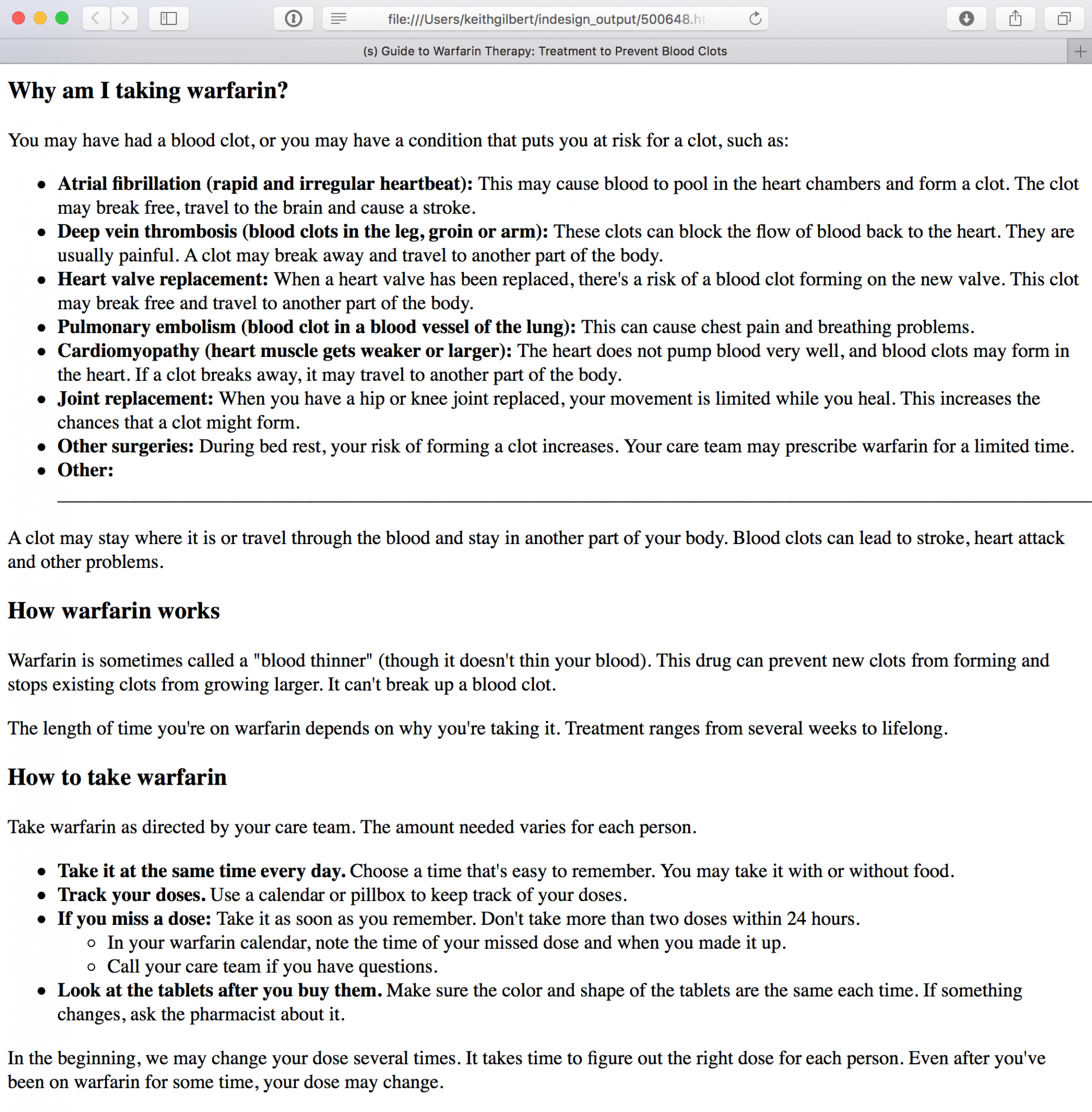 The end result? Now authors, subject matter experts, and production artists can collaborate on creating and maintaining a library of InDesign patient education materials that can be output to print, PDF, HTML, and XML for use in a variety of patient education repositories.