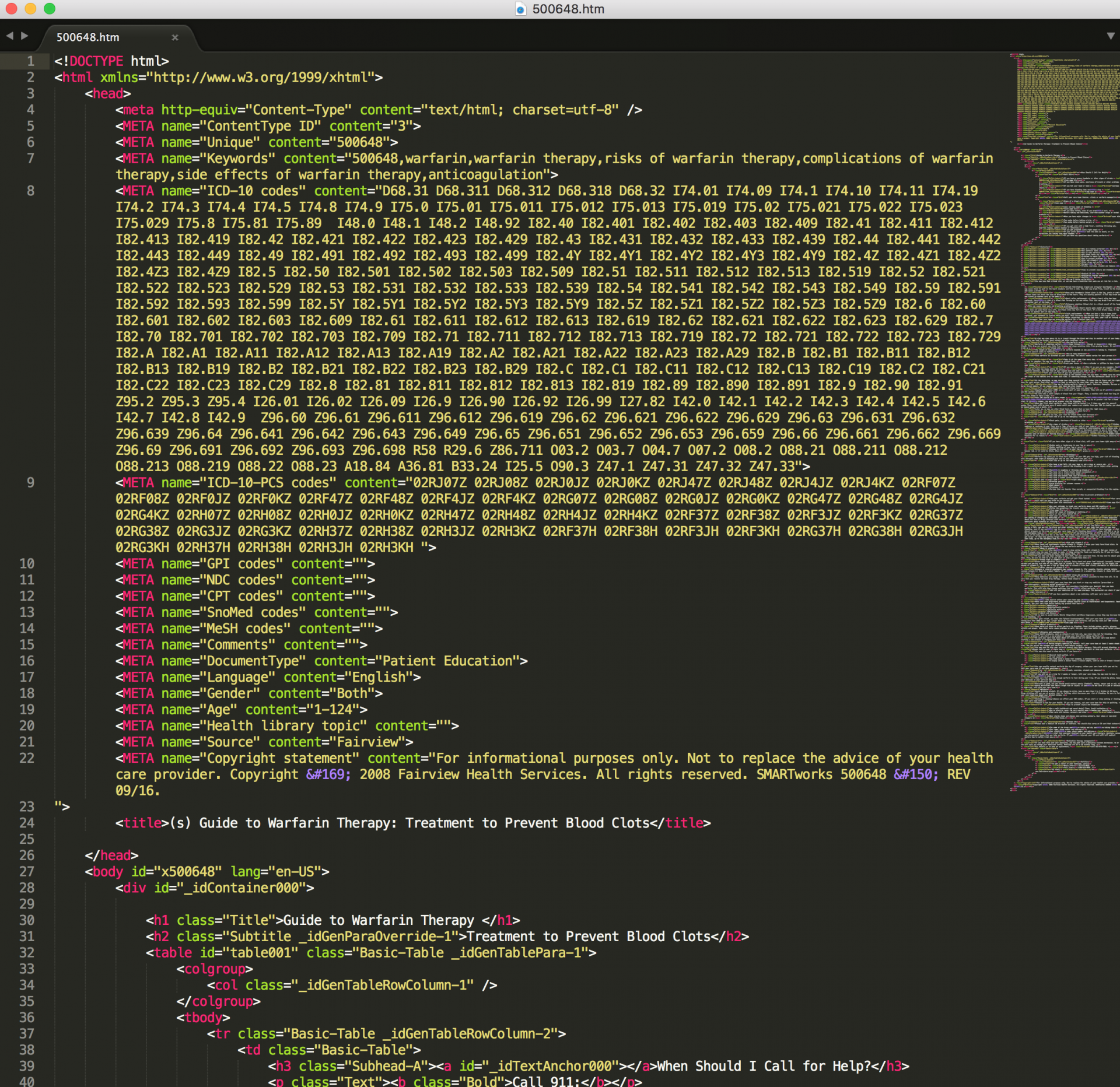 The project began with a giant spreadsheet listing all the InDesign file names on separate rows. Then, Fairview staff and medical coding experts filled in the columns of the spreadsheet with metadata about each file, such as key words, ICD-10 CM codes, document type, gender, age group, topic, language, etc.