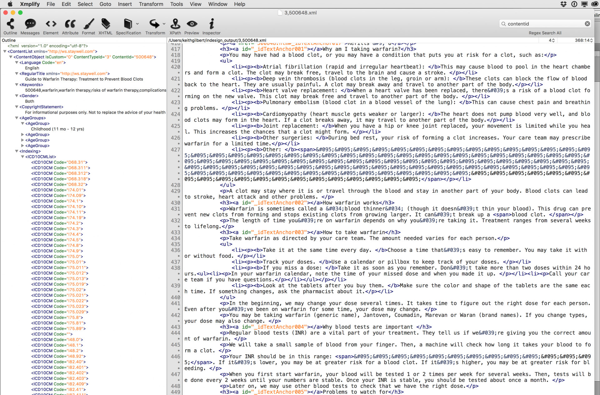 Fairview Health Services creates and maintains hundreds of print-format patient education materials that are created with Adobe InDesign. The content of these print-oriented materials needed to be re-purposed for use in various third-party and internal on-line patient education repositories accessed by a variety of doctors and health systems. Each of these repositories is run by a different company and has different data-import requirements and display capabilities. Some require HTML input, some XML input. Some require the XML to be structured one way, some require the XML to be structured a different way.