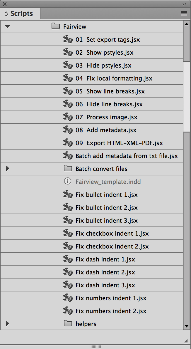 - I developed a series of scripts and comprehensive documentation to help InDesign production artists “normalize” the layout of InDesign content and get it prepared for export to HTML and XML output. These scripts assist with tasks such as verifying that the correct paragraph and character styles are applied to text, fixing bad line breaks, anchoring graphics to text, mapping styles to html tags, and applying alt text to images.