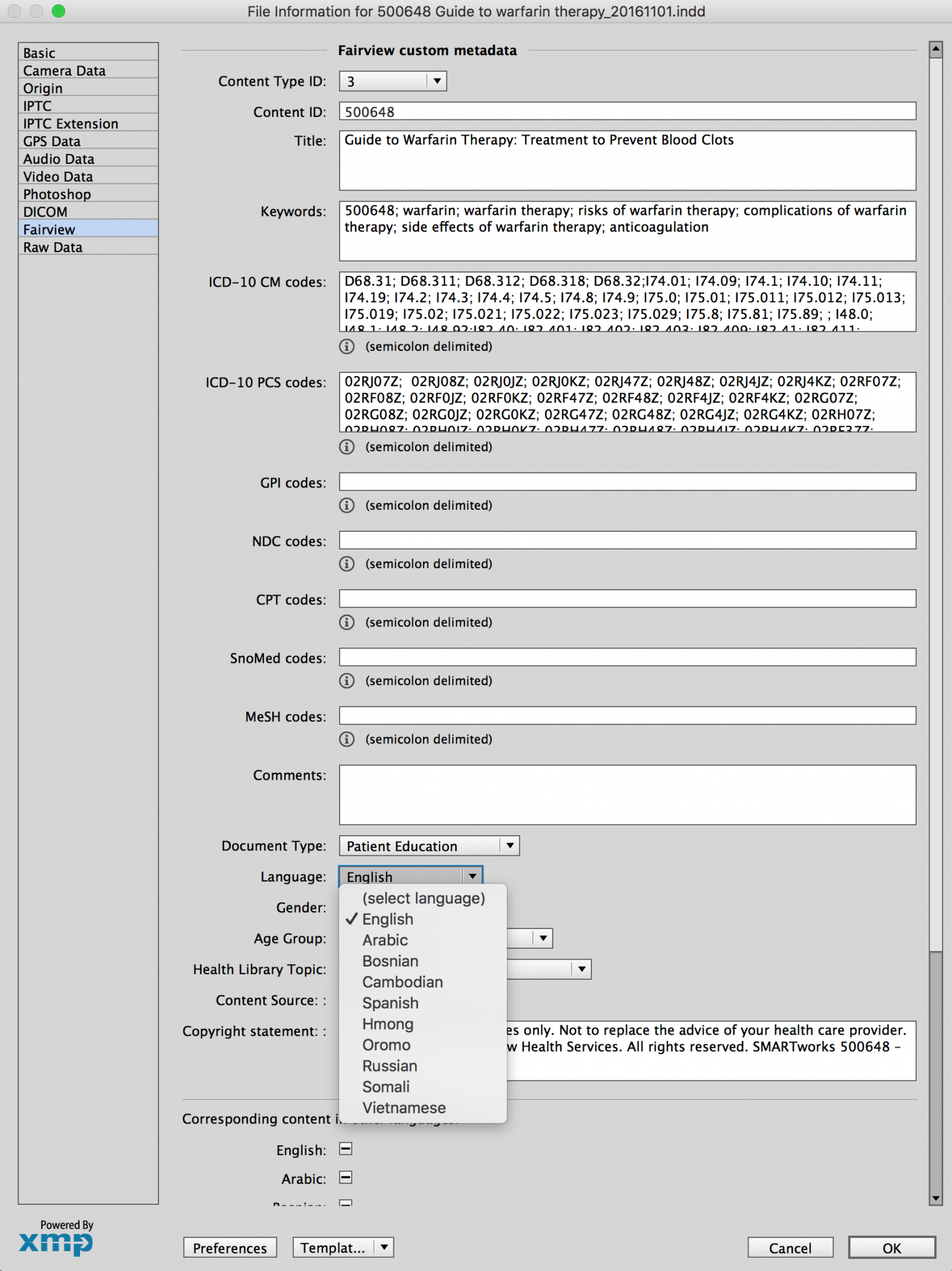 Next, I created a custom XMP Metadata panel for InDesign so that Fairview staff could maintain, edit, and add file-related metadata by choosing File > File Info in InDesign.