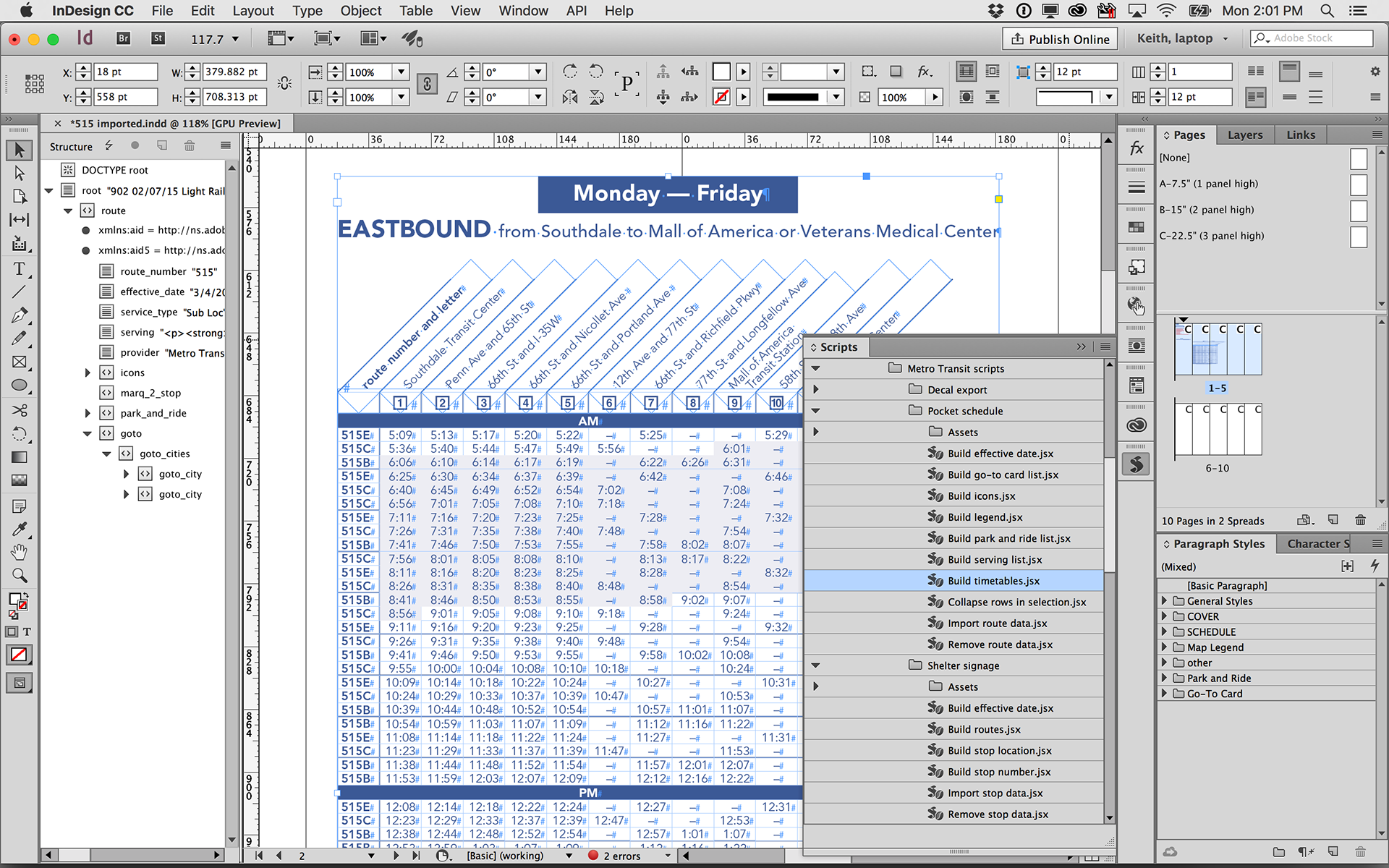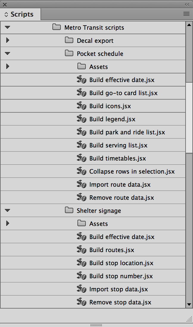 To help them automate the production of the pocket schedules, I created a series of InDesign scripts. Since the page sizes and layout of the pocket schedules vary greatly depending on the size and number of timetables, we focused our efforts on helping the designers produce the various pieces of the schedules automatically, leaving the layout of the pieces on the pages up to the designer.