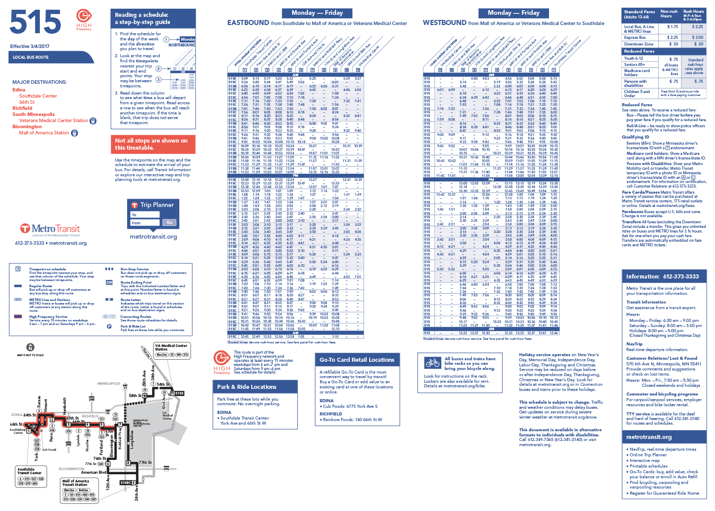 Metro Transit in Minneapolis/St. Paul creates printed pocket-sized folded schedules for all of their routes. Large quantities of signage and schedules for transit shelters are also produced, all in Adobe InDesign.