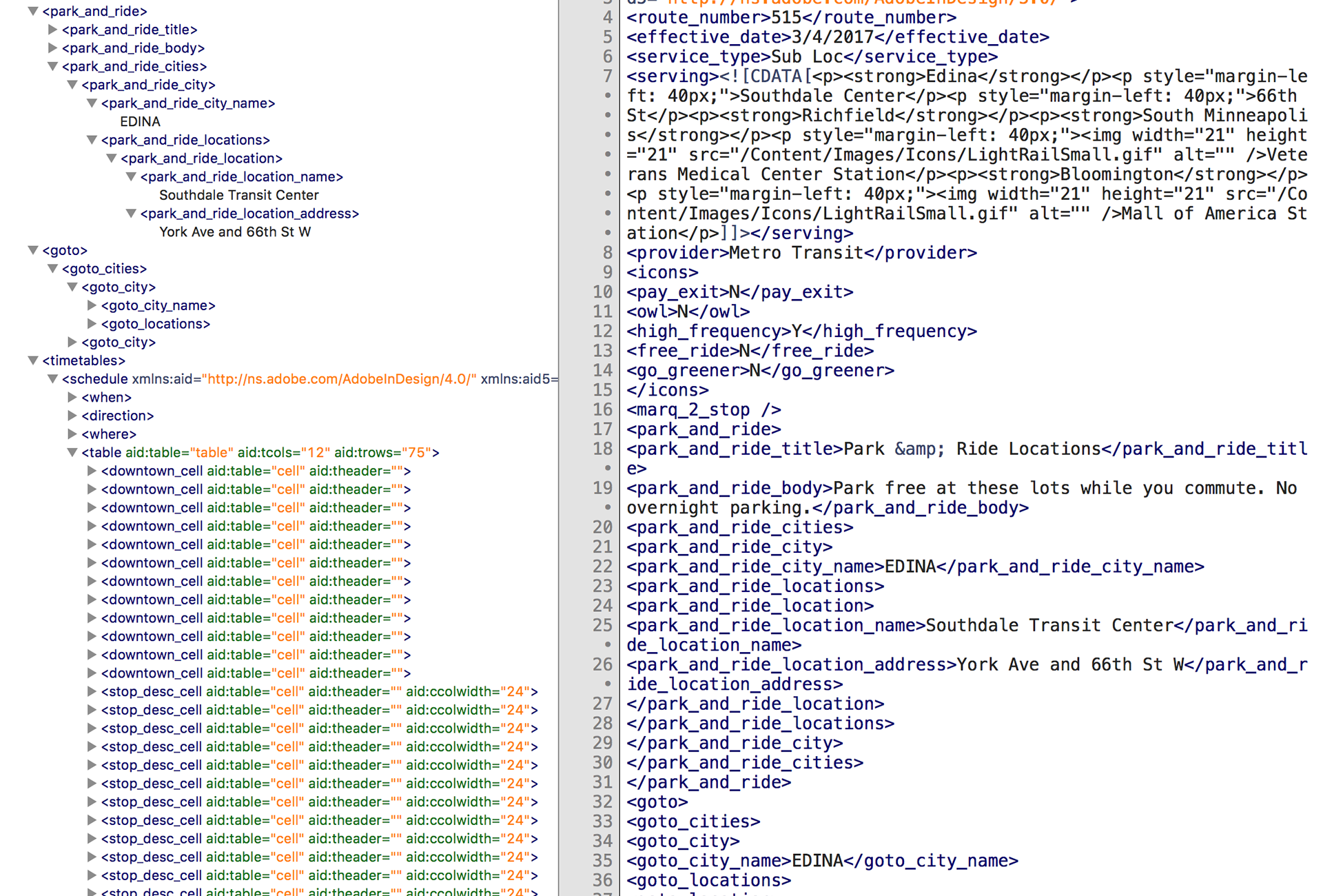 As the transit system grew to include not only bus routes but also bus rapid transit, trains, and light rail, manual layout of all of these printed materials was tedious, time-consuming, and error prone. I consulted with designers, planners, and IT staff at Metro Transit to help them automate the production of these various materials.